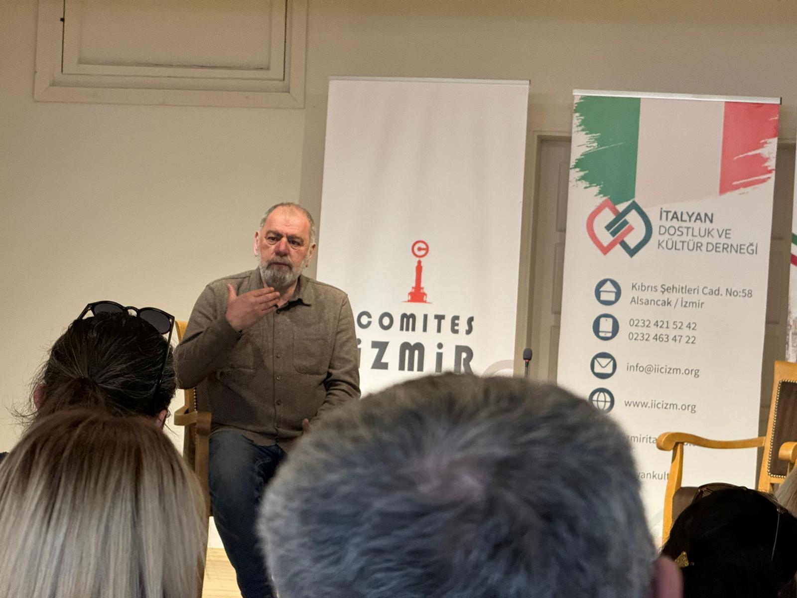 İkinci konuşmacı Sanat Tarihçisi Timur Guda ise İtalyan tarihinin sanatsal derinliklerdeki gücünü, dünyaya yayılan sanat akımlarını nasıl belirlediğini, mimarından heykeltraşlığına, resminden müziğine, operanın, balenin merkezi olduğunu, sinema ve tiyatrodaki geleneksel gücü arkasına alıp kalıcı eserler ortaya koyduğunu ayrıntılarıyla açıkladığı konuşmasında, şimdiki İtalya’yı oluşturan devletlerin her birinin sanatsal ve kültürel olarak yarattığı değerlerin artık dünya sanat ve kültür yaşamının ortak mirası olduğunun altını çizdi. Tiyatroda ise Dario Fo’nun geleneksel formlardan yararlanarak günümüzün toplumsal olaylarını hicvederek çağdaş bir sanat üreticisi olma sürecini kimi örneklerle anlatarak konuşmasını tamamladı.